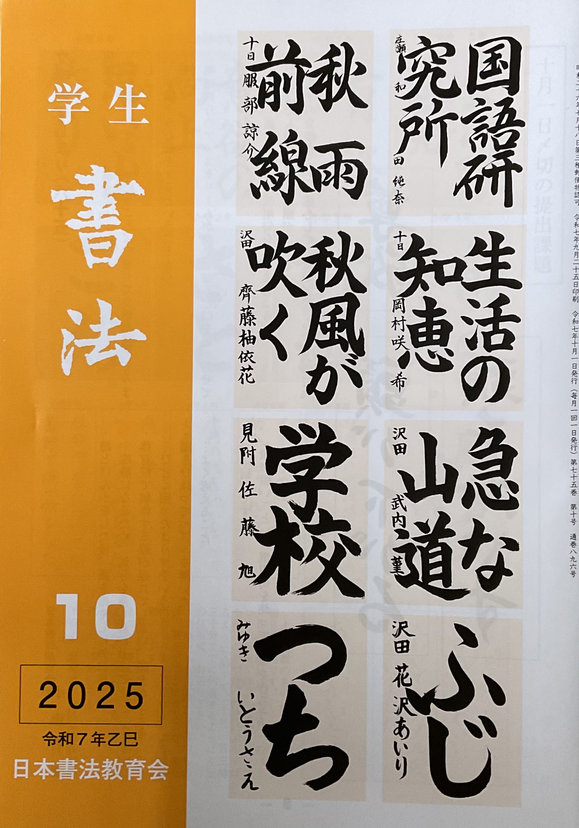 ブログ記事一覧 2025/09/21 Sun2025(令和7)10月の花 中学2,3年和田さん、滑らかな運筆で切れ味が良い。中学1年 服部さん、流れるような線の美しさがあり、見事。小学6年 岡村さん、本文、名前ともゆったりと安定した筆使いで落ち着きがあり見事です。 小学5年 斉藤さん、字形、運筆共に圧巻の作品で見事です。小学4年 武内さん、力強く正しい筆使いで書いてある作品、見事です。 小学3年 佐藤さん、力強く堂々とした作品です。小学2年 花澤さん、始筆、運筆、終筆ともに素晴らしい。名前も上手い。小学1年 伊藤さん、しっかりとした筆使いで、力強く堂々と書けました。 2025/07/24 Thu2025(令和7年)8月の花 中学2,3年吉澤さん、運筆、字形共に大きく伸びやかに書かれた素晴らしい作品。中学1年 諸橋さん、流れる様な線質で見事です。小学6年 岡村さん、伸びのある線と整った字形が美しい見事な作品です。 小学5年 坂井さん、のびのびとした線が心地よいです。 小学4年 沼澤さん、力強い線で一画一画丁寧に書かれた見事な作品。 小学3年 坪井さん、安定した運筆で見事な作品です。小学2年 橋本さん、伸びやかさ、勢いがあり、見事な作品です。小学1年 廣木さん、始筆も強く元気よく書けています。 2025/06/26 Thu第24回書法選抜展 公募 第8回書法学生書道展 開催 今年も、書法選抜展、学生書道展を行います。約350点の作品が並びます。本部役員、師範、準師範の大作の加え、小学生、中学生の元気で伸びやかな作品約350点並びます。ぜひご高覧ください。 2025/06/20 Fri2025(令和7年)7月の花 日本書法教育会 2025年 前期昇段級試験 成績優秀者(表紙)本会最高位6段取得の皆さん、おめでとうございました。今後の活躍を期待いたします。 2025/05/21 Wed2025(令和7年)6月の花 中学2,3年吉澤さん、行書の用筆が見事で、素晴らしい作品です。中学1年 中沢さん、中1とは思えない強い線で、すっきりと出来た作品です。 小学6年 岡村さん、伸びやかな線で基本がしっかりとしている。 小学5年 堀 さん、正確な運筆、字形も整った素晴らしい作品。 小学4年 武内さん、文句なしのトップ賞。本文、名前共に見事。 小学3年 坪井さん、字形、バランス、名前共に素晴らしい。小学2年 花澤さん、のびやかな線で勢いもあり、すばらしい作品です。小学1年 中平さん、力強く堂々と書けました。 2025/04/20 Sun2025(令和7年)5月の花 中学2,3年川原さん、穏やかな用筆ながら躍動感に富み、作品の雰囲気に深い魅力があります。中学1年 諸橋さん、堂々と力強く、安定感のある運筆は見事です。小学6年 前田さん、本文、名前ともに安定した筆使いで、落ち着きがあり見事。小学5年 高橋さん、運筆よく大らかな風格を感じる良い作品です。小学4年 坂田さん、一点一画集中して、丁寧に書き上げました。小学3年 坪井さん、運筆がとても素晴らしくのびやかで明るい作品。小学2年 花澤さん、正しい筆使い、字形もよくしっかりと書かれて立派な作品です。小学1年 伊藤さん、堂々とした筆使い(はね、のばし)で素晴らしい作品です。 2025/03/20 Thu2025(令和7年)4月の花 中学2,3年長谷川さん、伸び伸びと重厚で風格のある作、見事です。中学1年 吉澤さん、筆の開閉を使った運筆は見事です。やや全体に大き過ぎ。小学6年 北原さん、安定した運筆で線質も美しく、名前まで丁寧に書けていてお見事です。小学5年 岡村さん、本文、名前共に見事な用筆。流石です。小学4年 高橋さん、真面目さが伝わる字形整った作品。小学3年 酒井さん、字形が良く整い始筆、終筆も丁寧です。小学2年 熊倉さん、すっきり力強く書けました。小学1年 花沢さん、ていねいな筆使いと大胆な運筆で素晴らしい作品に出来上がっています。 2025/02/21 Fri2025(令和7年)3月の花 中学2,3年川原さん、強い線で書かれて力強さを感じます。中学1年 吉澤さん、力強くしっかりとした運筆で迫力満点の作、お見事です。小学6年 諸橋さん、重厚で風格のある作品。お見事です。小学5年 小林さん、安定した正確な筆使いで、バランスの良い字形。堂々としていて素晴らしい。小学4年 今井さん、基本の筆使いが良く出来ていて全体のバランスも素晴らしい。小学3年 相田さん、紙いっぱいにのびやかに書き上げたこの”迫力感”が素晴らしい。小学2年 福﨑さん、のびやかで堂々としていて見事な作品。小学1年 忠地さん、力強く見事な作品です。 2025/01/23 Thu2025(令和7年)2月の花 中学2,3年品田さん、独特な横線の運筆が伸びやかで、力強さを感じさせます。字形も良く見事。中学1年 吉澤さん、線の強弱が見事で、全体の調和が取れています。小学6年 北原さん、強い線質でさわやか。小学5年長谷川さん、運筆よく、見事な作品です。小学4年 齊藤さん、筆使いが正しく、字形も整った見事な作品です。小学3年 武内さん、堂々と力強く安定感のある運筆ですばらしい。小学2年 金子さん、基本がしっかりとしていて名前もうまい。小学1年 花澤さん、始筆、終筆ときれいな筆使いです。 2024/12/20 Fri2025(令和7年)1月の花 中学2,3年多田