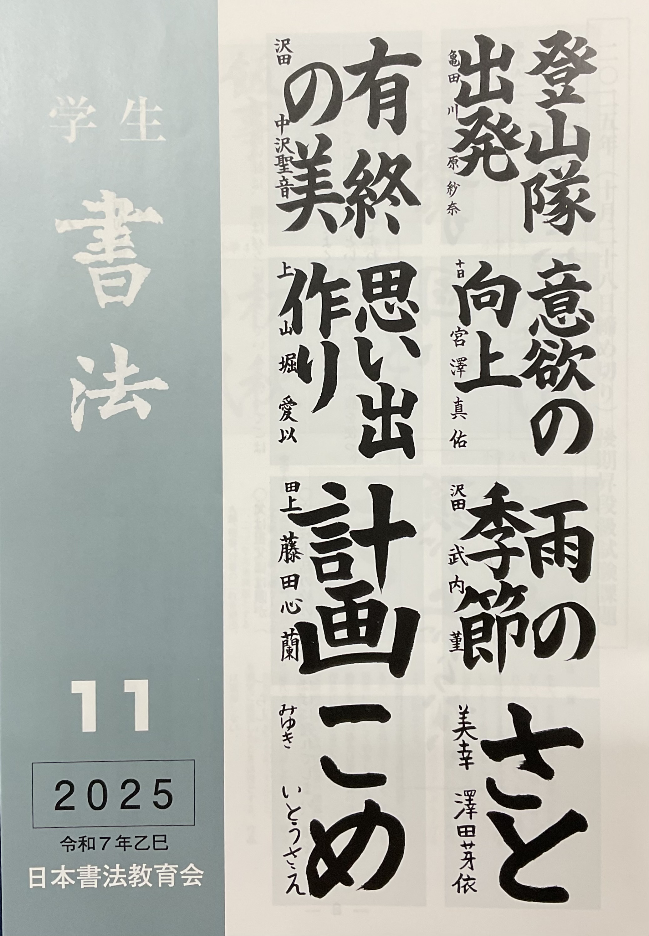 2025/10/19 Sun2025(令和7)11月の花 中学2,3年川原さん、流れるような線質でさわやかです。中学1年 中沢さん、穂先まで緊張感を持って書いてあり美しい。小学6年 宮沢さん、整った字形と力強い運筆の見事な作品。小学5年 堀 さん、堂々としていて本文・名前とも見事な作品。小学4年 武内さん、本文・名前共に文句なしの秀逸作品。 小学3年 藤田さん、力強く堂々とした上位者を上回る作品。今後が楽しみです。小学2年 澤田さん、基本がしっかりして、伸びのある線が素晴らしい。小学1年 伊藤さん、始筆、送筆、終筆ともに素晴らしい。名前も上手い。 1 / 1 1