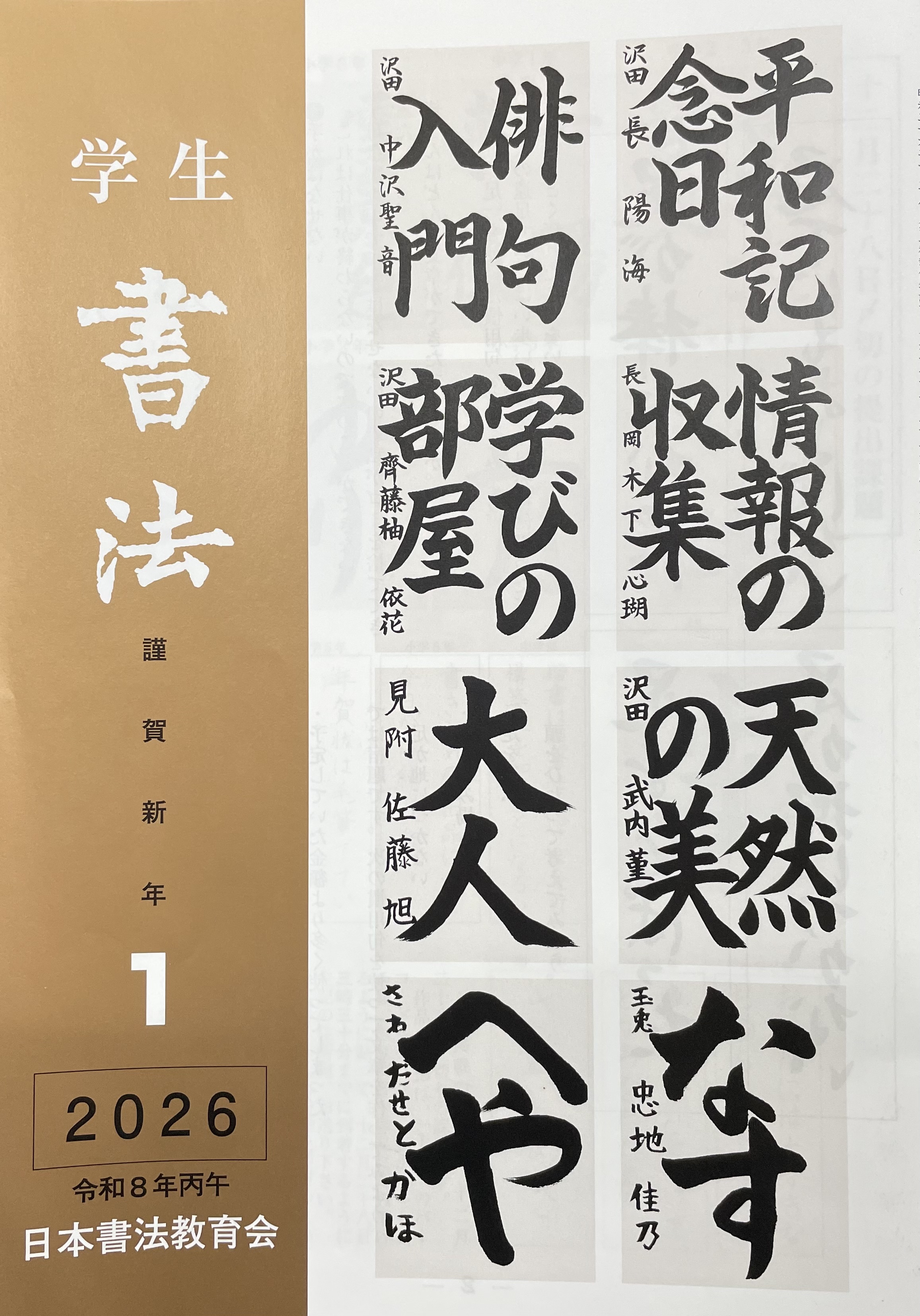 ブログ記事一覧 2026/01/06 Tue2026(令和8)1月の花 中学2,3年 長さん、堂々とした運筆で、安定した字形で見事です。中学1年 中沢さん、流れるような爽やかな線で素晴らしい。小学6年 木下さん、力強く伸びやかな線質で紙面に上手くおさまり見事な作品。小学5年 斉藤さん、穂先まで神経を行き届かせた素晴らしい作品。小学4年 武内さん、本文、名前共にしっかりした運筆で安定感のある伸び伸びとした作品。 小学3年 佐藤さん、勢いもあり堂々とした素晴らしい作品。小学2年 忠地さん、紙面に対し、バランス良く大きく書けた。小学1年 世戸さん、大きく堂々と書けています。始筆、終筆もきれいで素晴らしい。 1 / 1 1